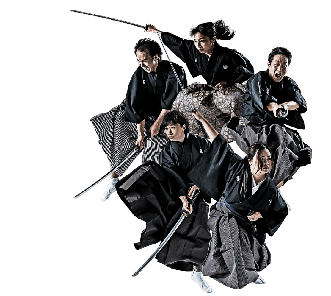 殺陣専門のパフォーマンス集団です。迫力、気迫、息をするのをわすれる程の緊張感と、見終わった時の爽快感。激しい振り付けでの動的な美しさや、構えや斬り終えた形の静的な美しさ。生のパフォーマンスならではの息づかいや間の緊張感、舞台とお客様の一体感が魅力です。