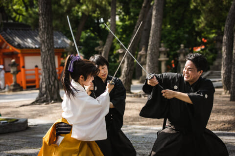 殺陣だけでなく舞踊、剣舞、アクロバットも含んでおりバラエティ溢れるショーを披露。実際に間近で見て聞いて感じて、そして体験することで、より一層「殺陣」という日本の伝統芸能の迫力や魅力に触れていただけます。